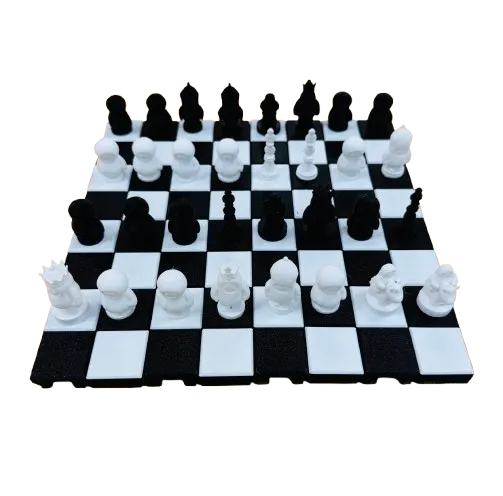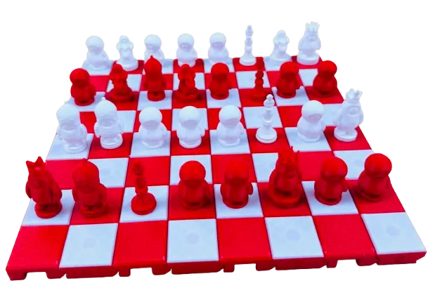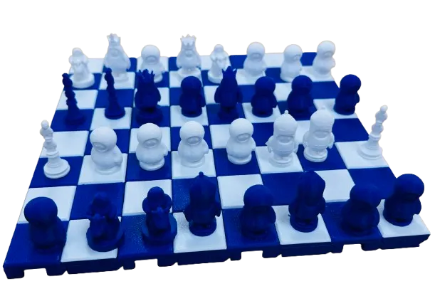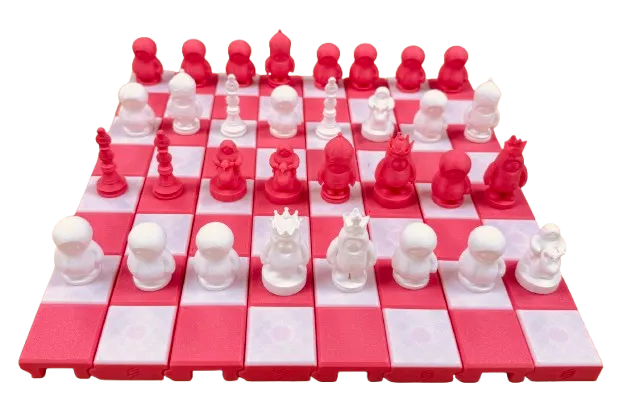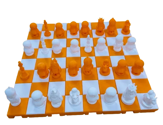 The chess pieces were designed by students from our 3D Toy Design Club, a student-centered program inspired by the game Fall Guys. Each piece may vary from the photo. This chess design is truly one of a kind.